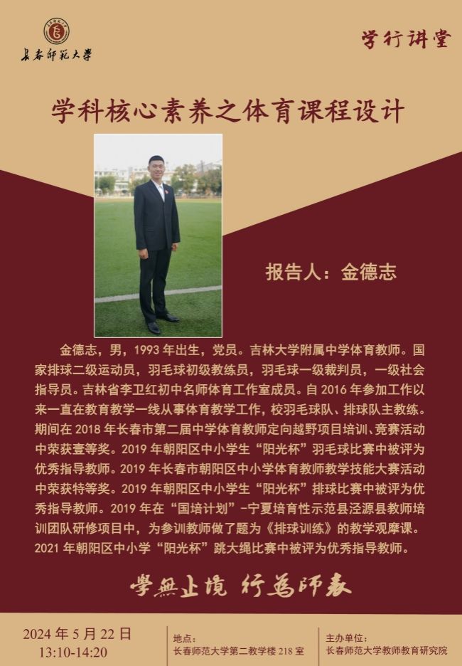 金德志,男,1993年出生,党员。吉林大学附属中学体育教师。国家排球二级运动员,羽毛球初级教练员羽毛球,一级裁判员,一级社会指导员。吉林省李卫红初中名师体育工作室成员。自2016年参加工作以来一直在教育教学一线从事体育教学工作,校羽毛球队、排球队主教练。期间在2018年长春市第二届中学体育教师定向越野项目培训、竞赛活动中荣获壹等奖。2019年朝阳区中小学生“阳光杯”羽毛球比赛中被评为优秀指导教师。2019年长春市朝阳区中小学体育教师教学技能大赛活动中荣获特等奖。2019年朝阳区中小学生“阳光杯”排球比赛中被评为优秀指导教师。2019年在“国培计划”-宁夏培育性示范县泾源县教师培训团队研修项目中,为参训教师做了题为《排球训练》的教学观摩课。2021年朝阳区中小学“阳光杯”跳大绳比赛中被评为优秀指导教师。