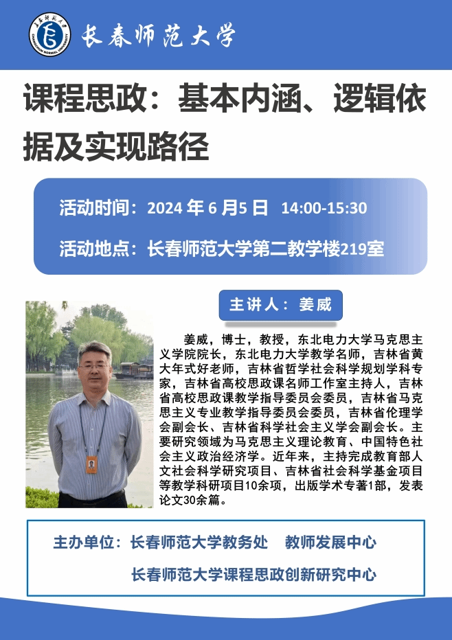 姜威,博士,教授,东北电力大学马克思主义学院院长,东北电力大学教学名师,吉林省黄大年式好老师,吉林省哲学社会科学规划学科专家,吉林省高校思政课名师工作室主持人,吉林省高校思政课教学指导委员会委员,吉林省马克思主义专业教学指导委员会委员,吉林省伦理学会副会长、吉林省科学社会主义学会副会长。主要研究领域为马克思主义理论教育、中国特色社会主义政治经济学。近年来,主持完成教育部人文社会科学研究项目、吉林省社会科学基金项目等教学科研项目10余项,出版学术专著1部,发表论文30余篇。