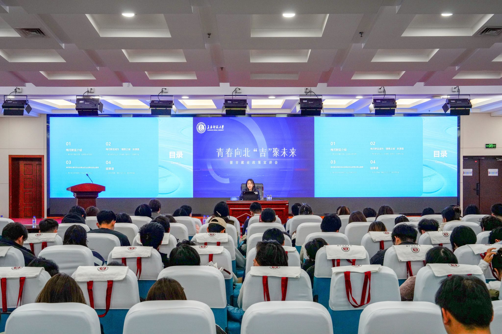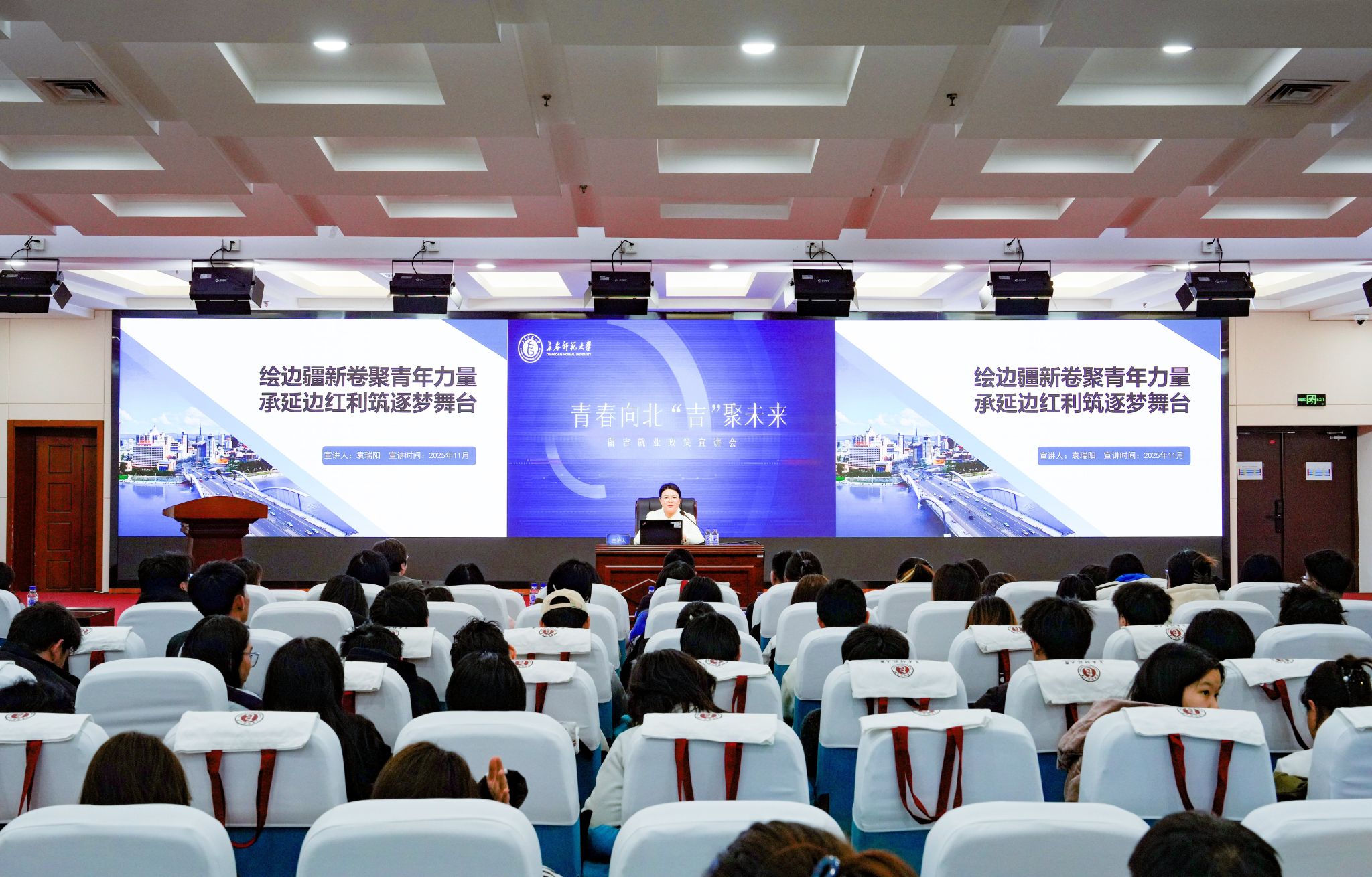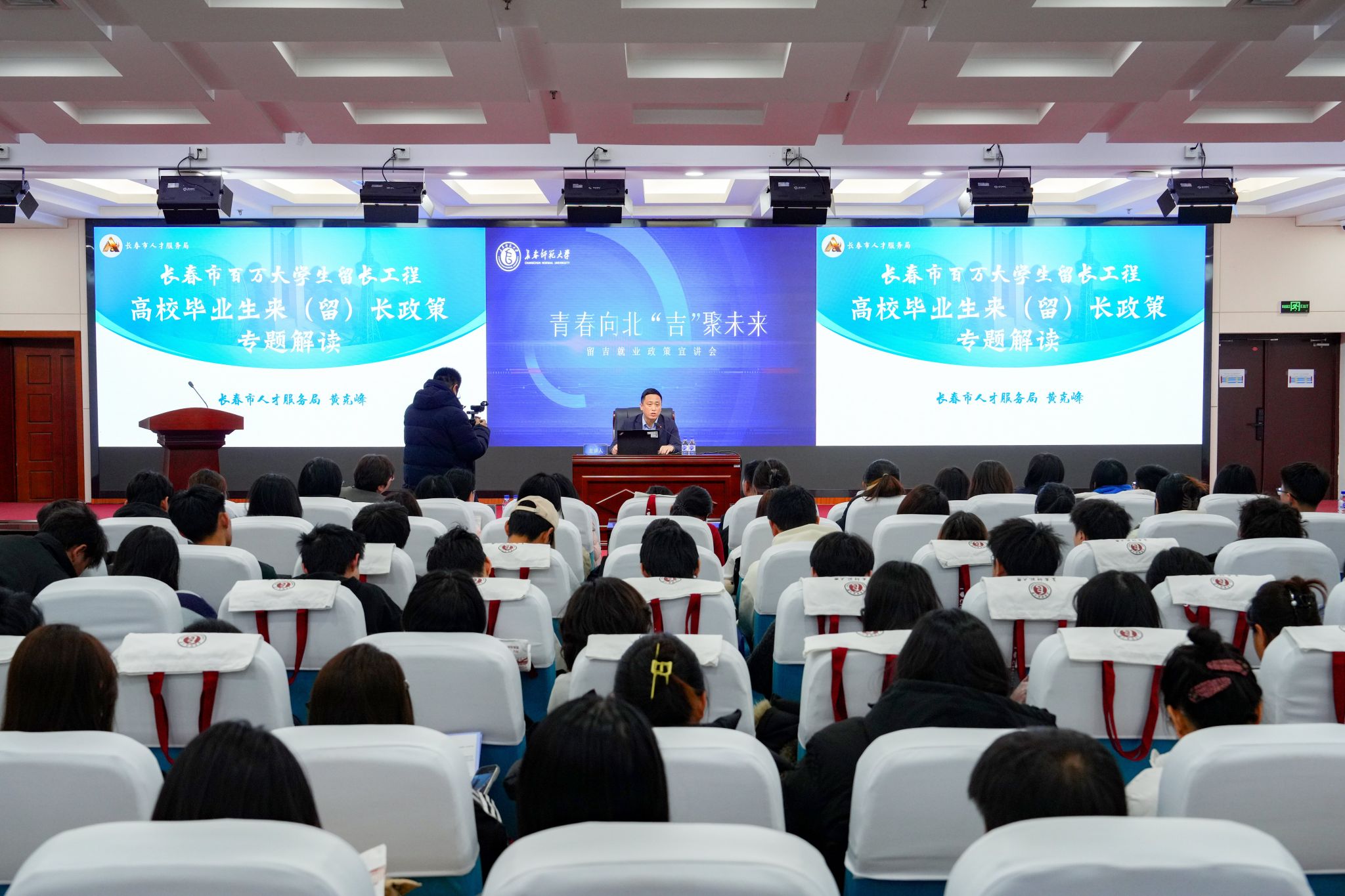 宣讲会现场,穆永久率先解读了吉林省高校毕业生就业创业6项补贴政策,涵盖就业生活补贴、就业创业一次性购房补贴等硬核举措;黄克峰详细介绍了长春市“百万大学生留长工程”,系统解读了长春市促进高校毕业生等青年群体来(留)长系列优惠政策;石惠以“江城有‘位’来 奋斗谱‘新’篇”为主题,全面展示了吉林市重点产业人才需求图谱;袁瑞阳从区位优势、经济发展、文旅产业、生态赋能等方面切入,描绘出一幅求才若渴、政策优厚的边疆新卷;董华锋真诚分享了梅河新区作为青年发展“理想之城”的核心要素以及全链条就业服务体系。现场发放政策手册1200余份。