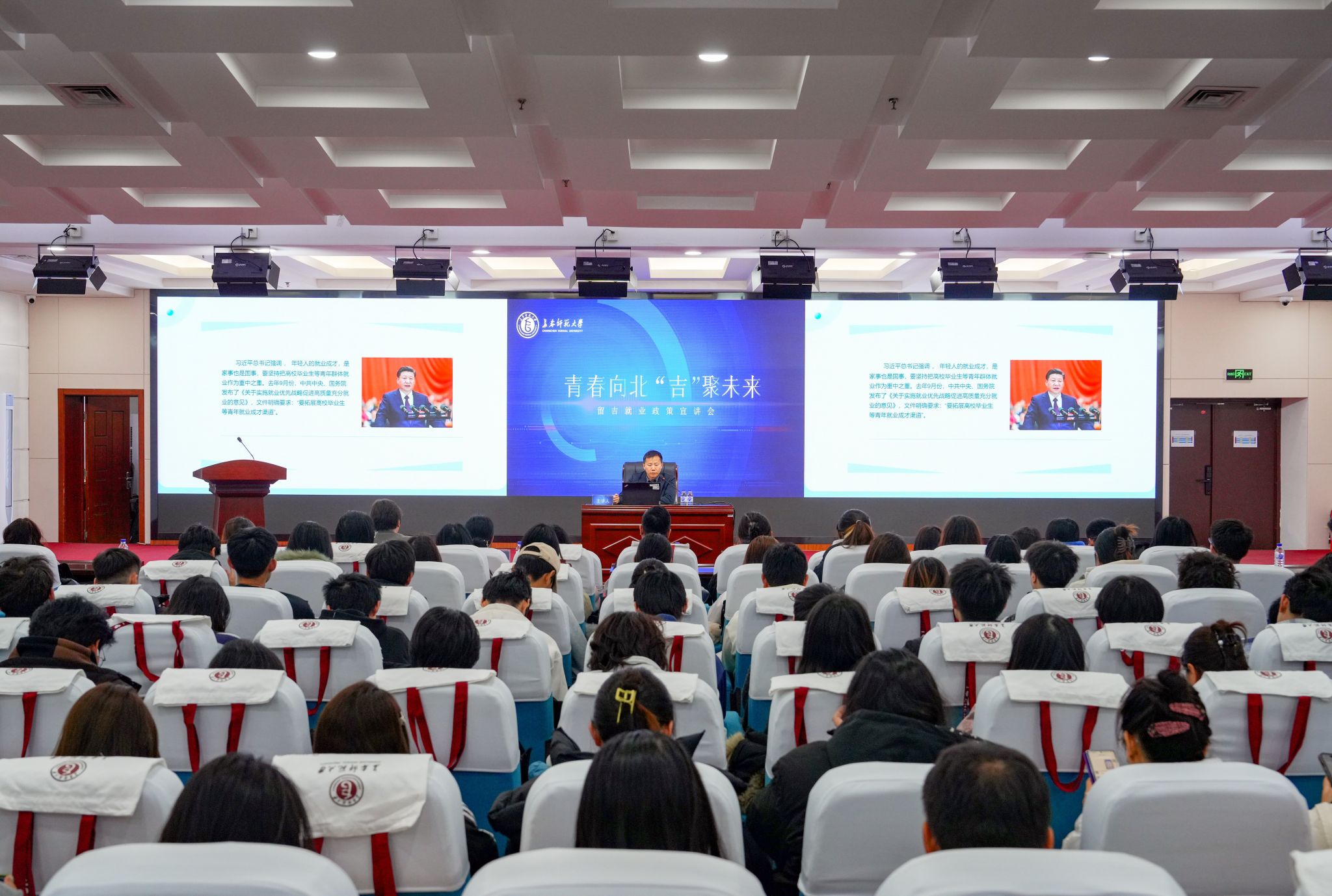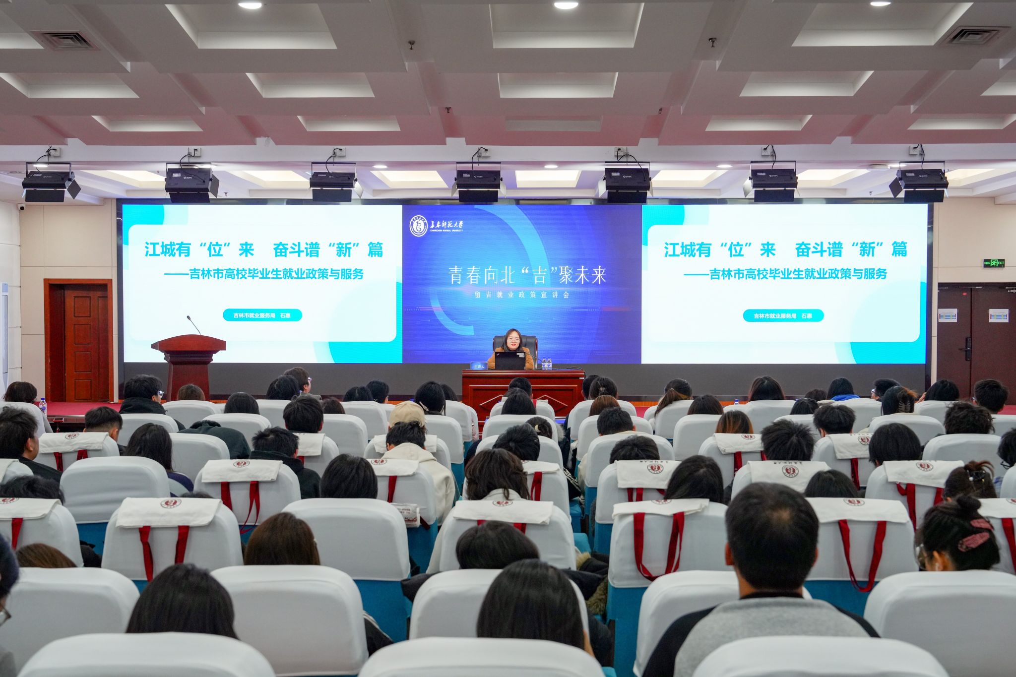 11月26日,学校在长吉校区新图书馆报告厅举办“青春向北 ‘吉’聚未来”留吉就业政策宣讲会。吉林省就业服务局职业介绍处副处长穆永久、长春市人才服务局青年人才处副处长黄克峰、吉林市就业服务局职业介绍指导科科长石惠、延边朝鲜族自治州就业服务局就业指导科科长袁瑞阳、梅河口市就业服务局农技工培训中心主任董华锋受邀进校宣讲。