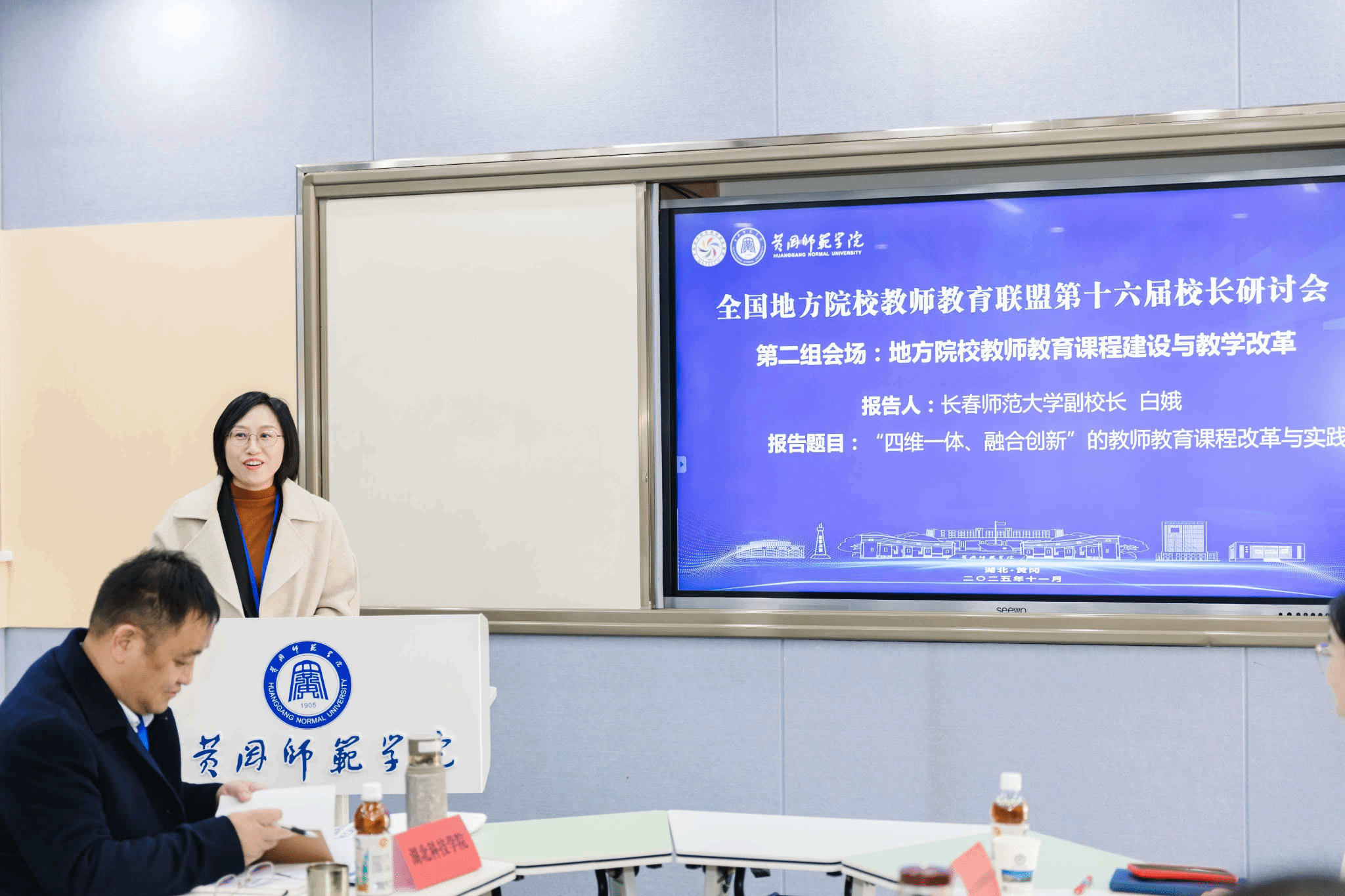 会上,白娥以“‘四维一体、融合创新’的教师教育课程改革与实践”为题,系统阐述了长春师范大学在教师教育领域的探索成果与实践经验。同时,与来自全国各地的院校领导、专家学者围绕教师教育改革热点问题展开深入交流,就课程创新、协同育人、数字赋能等方面的合作进行探讨。