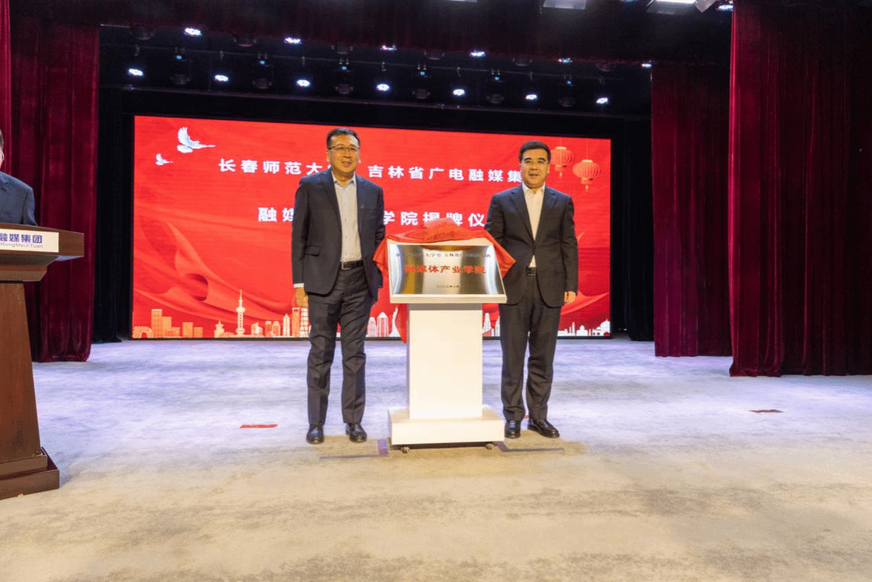 随后,长春师范大学党委书记刘多教授,省委宣传部副部长、吉林广播电视台党组书记、台长刘铁铎,共同为融媒体产业学院揭牌。学院的成立标志着长春师范大学和吉林在融媒体领域的深度合作,协同推动融媒体产业和文旅、影视产业的发展。