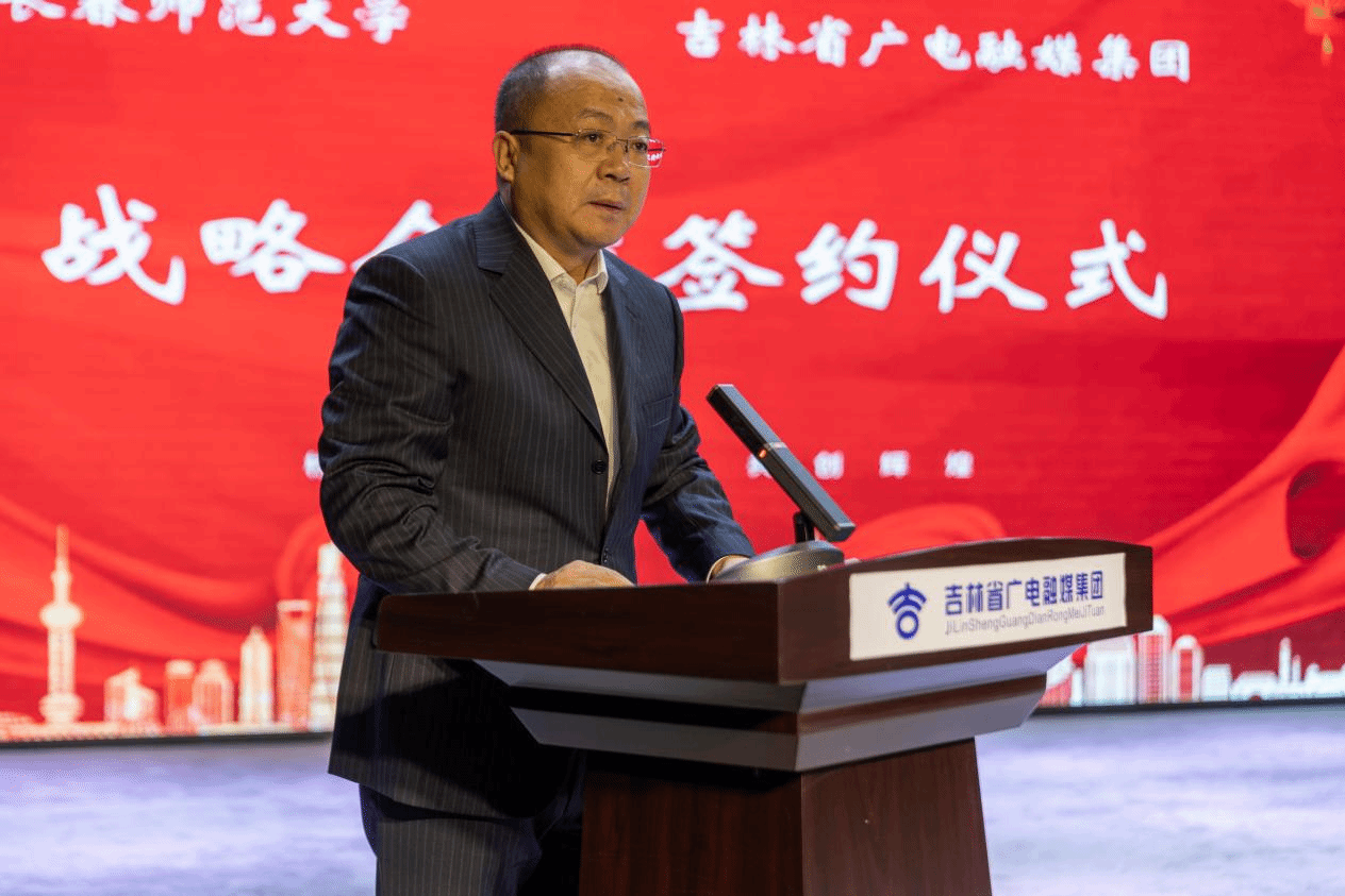 活动第一项,长春师范大学党委副书记、校长王延明教授与吉林广播电视台党组成员、总编辑谢荣分别代表长春师范大学、吉林省广电融媒集团致辞。